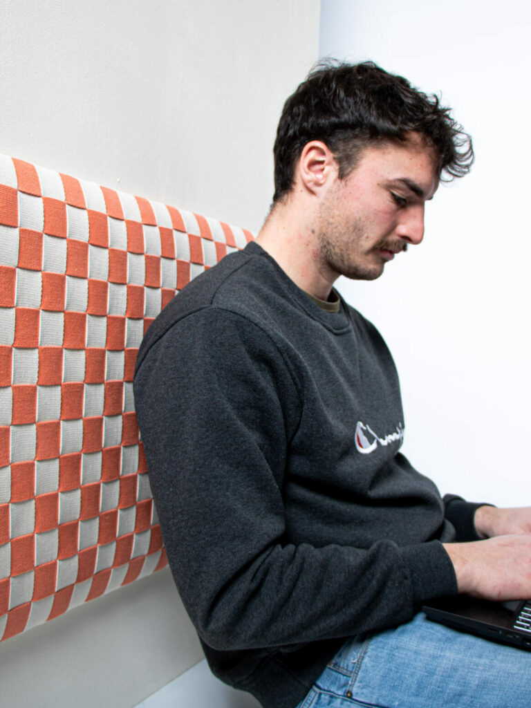 Das WANDWUNDER verbindet Funktionalität mit Ästhetik. Als Rückenpolster verleiht es dem Bett mehr Komfort und ermöglicht bequemes Sitzen zum Lesen, Arbeiten oder Entspannen – besonders in kleinen WG-Zimmern, in denen oft kein Platz für eine zusätzliche Sitzgelegenheit ist. So entsteht eine praktische und platzsparende Alternative zum klassischen Stuhl. Dank seiner flexiblen Nutzung passt das Wandwunder zu nahezu jedem Bett und kann auch bei bereits gepolsterten Varianten als Pinnwand oder Wandpaneel weiterverwendet werden. Die gewebten Gurte erzeugen eine markante Textur, die nicht nur optisch wirkt, sondern dem Raum eine warme, einladende Atmosphäre verleiht.